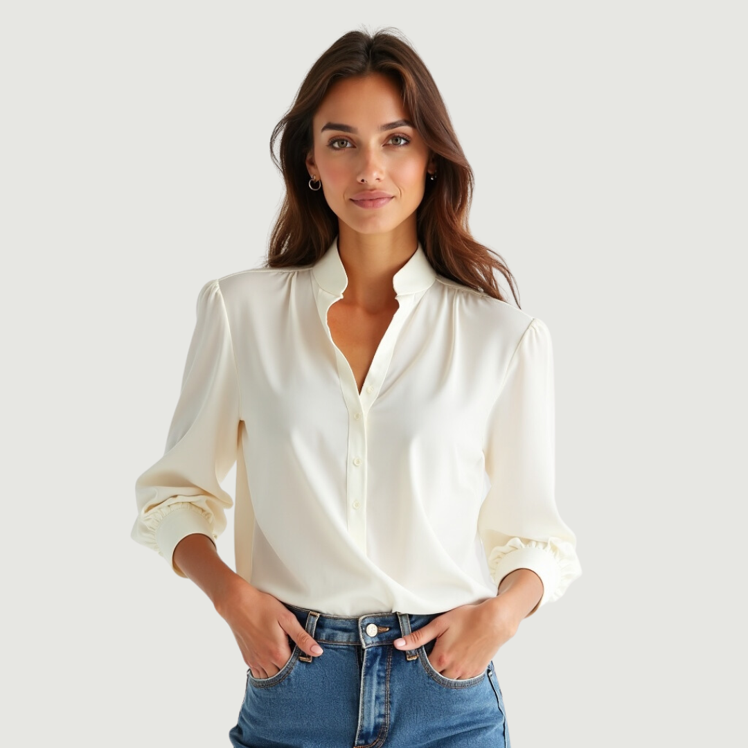 A refined, high‑collar blouse crafted from soft, breathable fabric, designed to bring effortless sophistication to any outfit. Lightweight, versatile, and beautifully tailored, it transitions seamlessly from office chic to evening elegance.