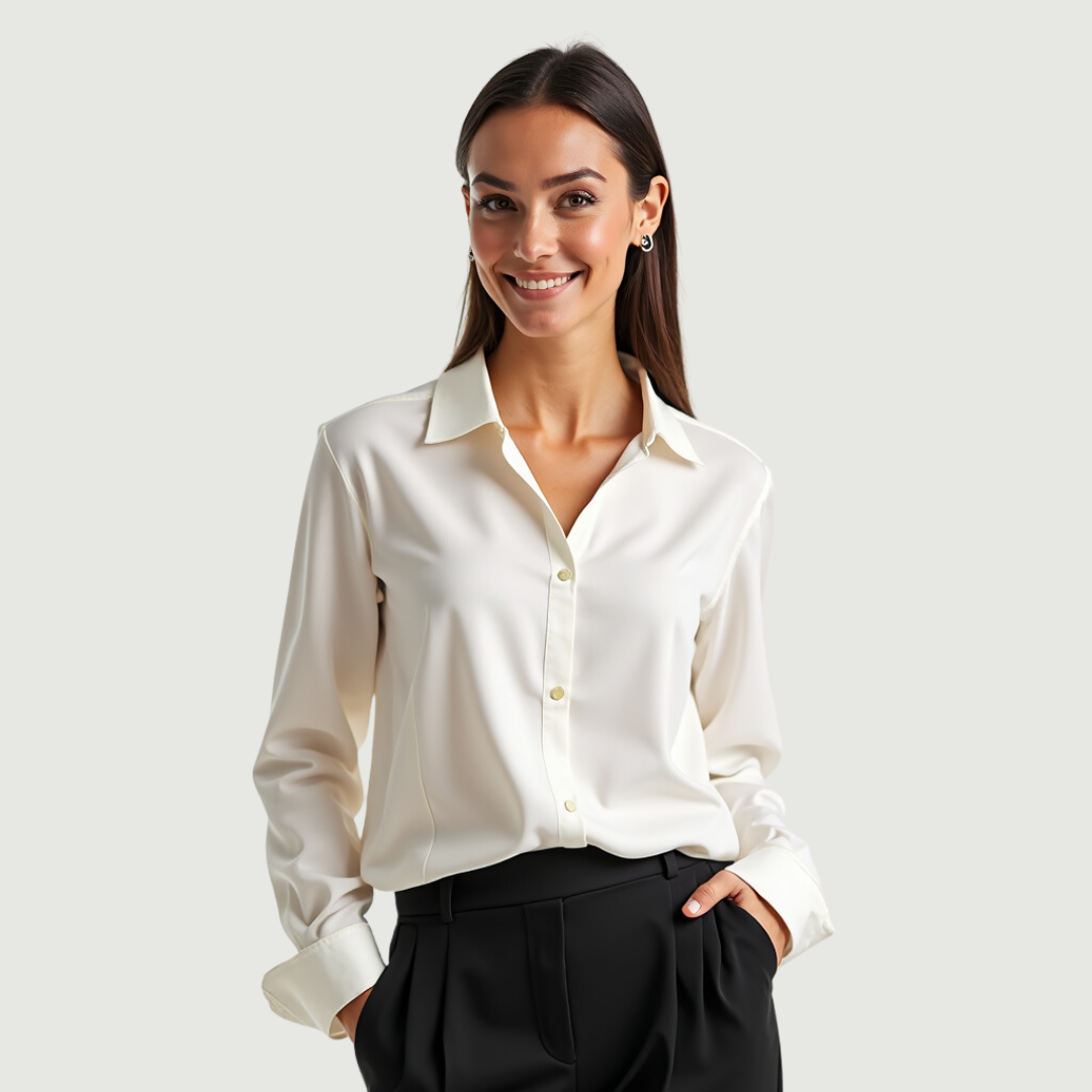 The classic button‑down front adds a touch of structure, making it ideal for professional settings, while the long sleeves — easily rolled up for a relaxed feel — provide styling versatility. The structured collar enhances its clean, elevated aesthetic, allowing the blouse to transition seamlessly from workwear to casual chic.